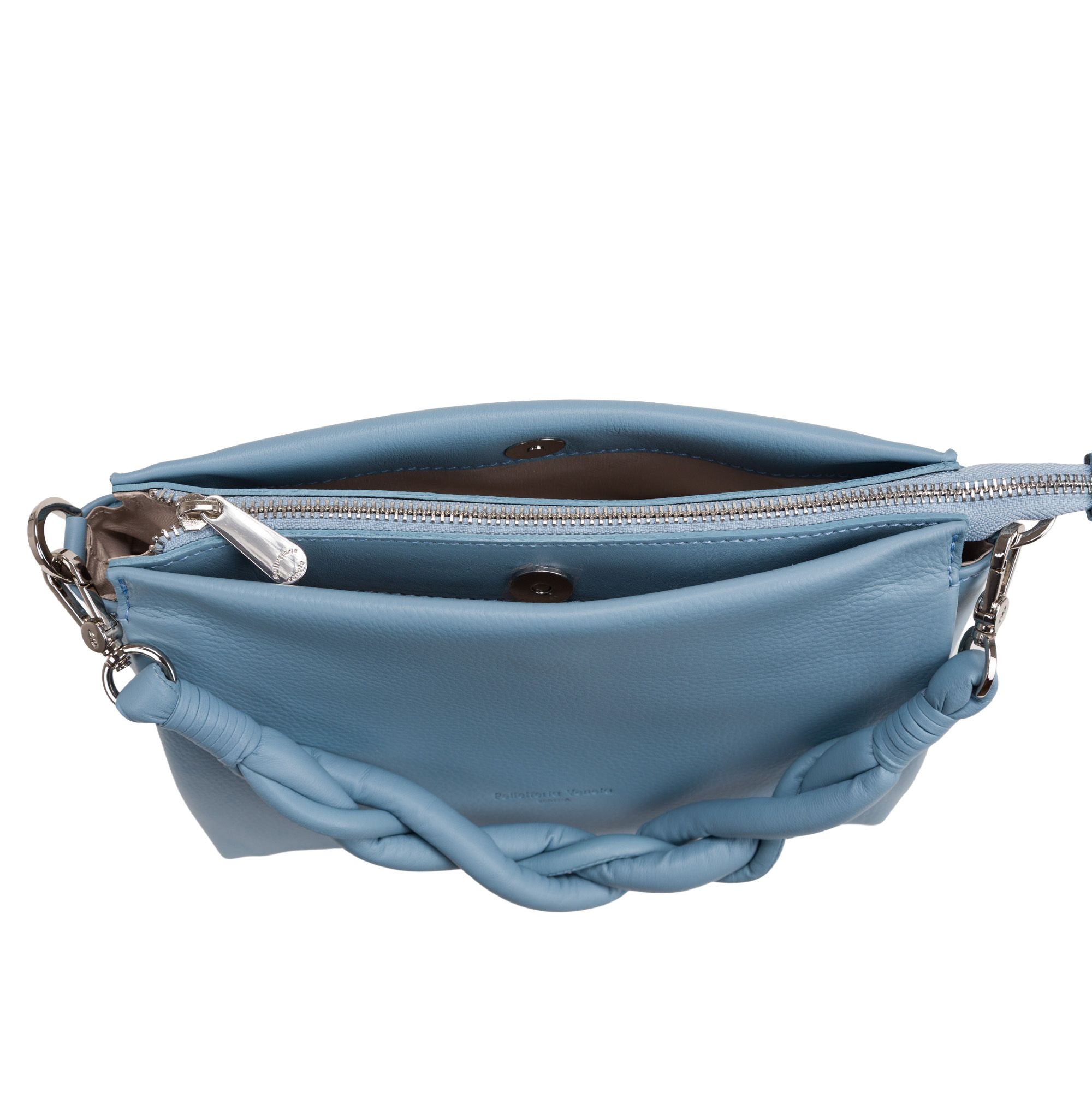 – 3 separate compartments: one main space with zip and 2 side compartments with magnetic closure