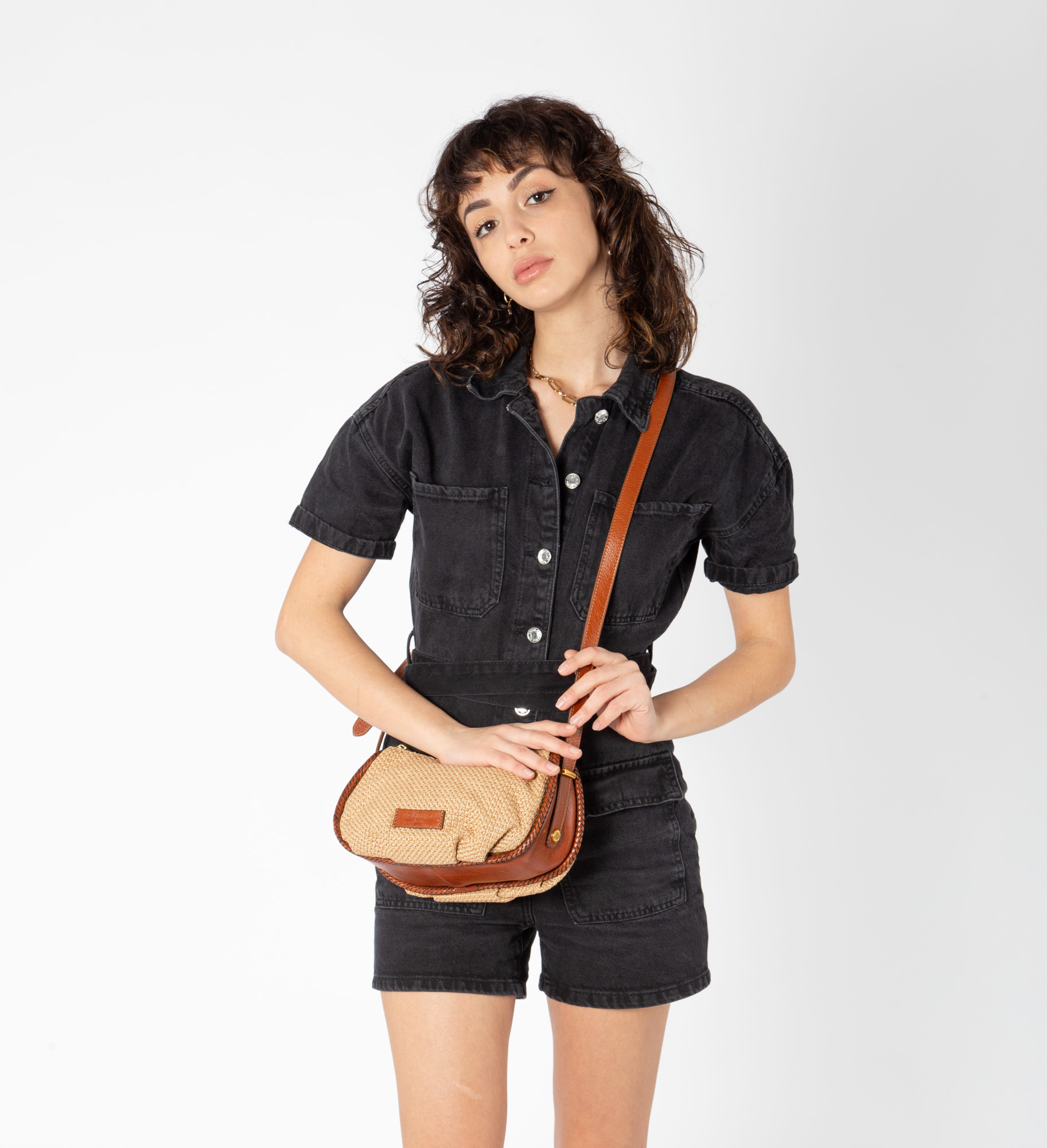 Tracolla in paglia intrecciata con dettagli in pelle vacchetta